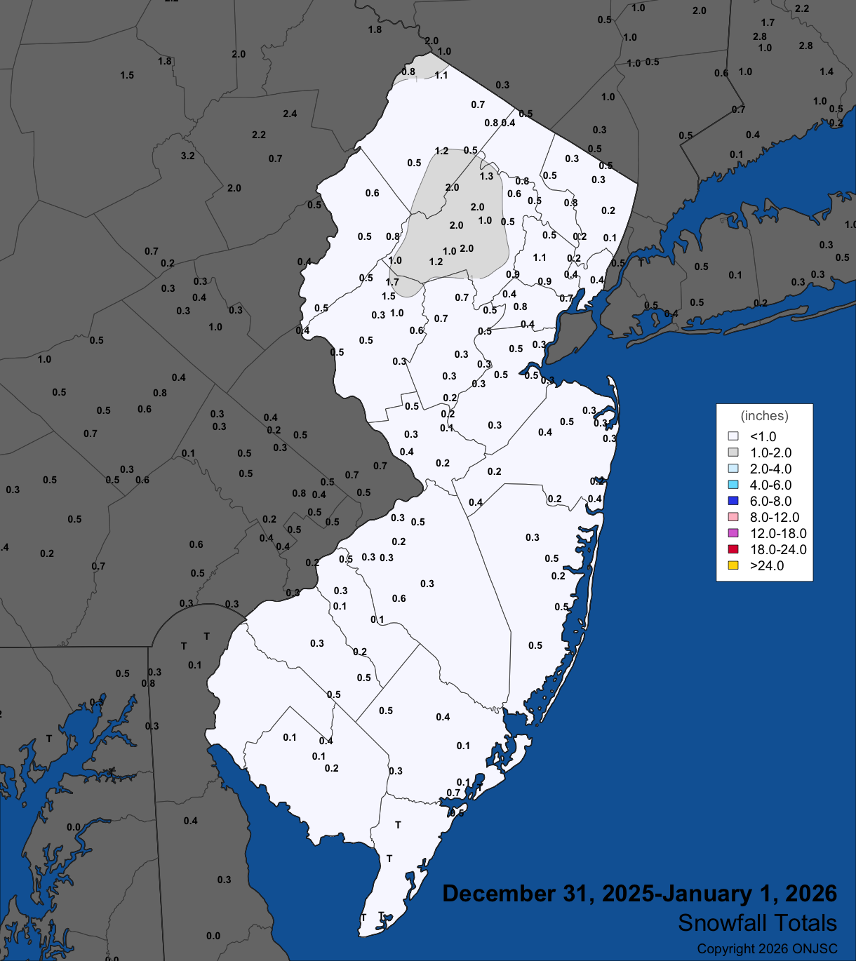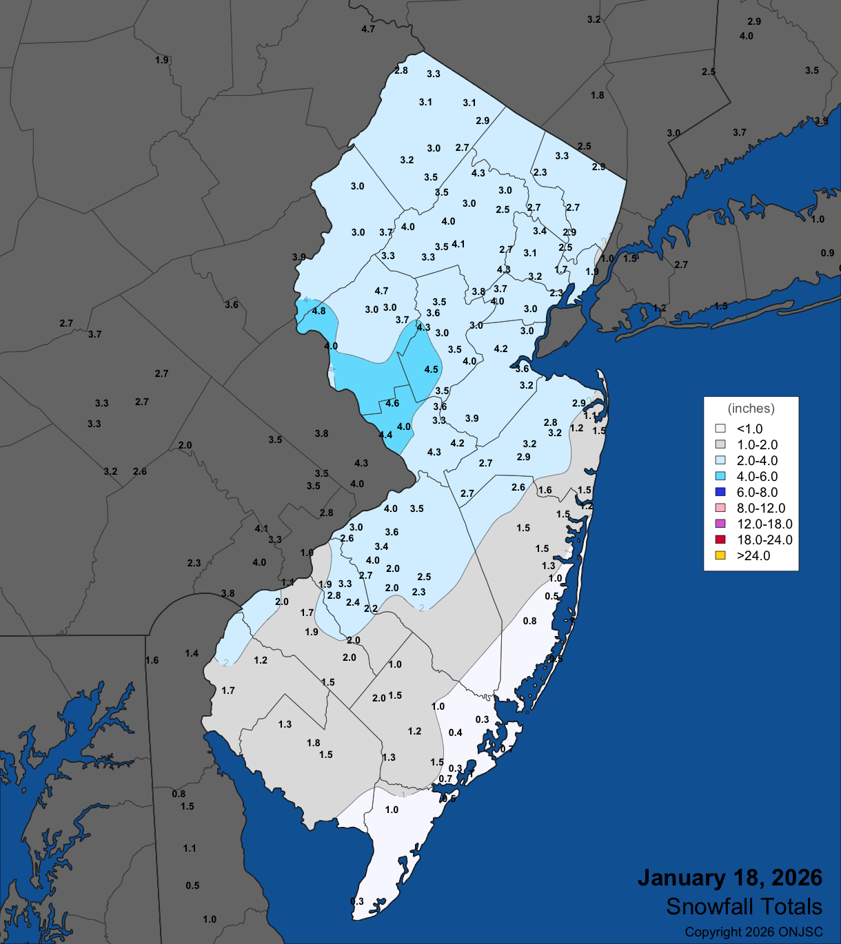 Snowfall amounts (inches) are taken from reports gathered by the NJ State Climatologist and the National Weather Service (NWS) Offices in Mt. Holly, NJ and Upton, NY.